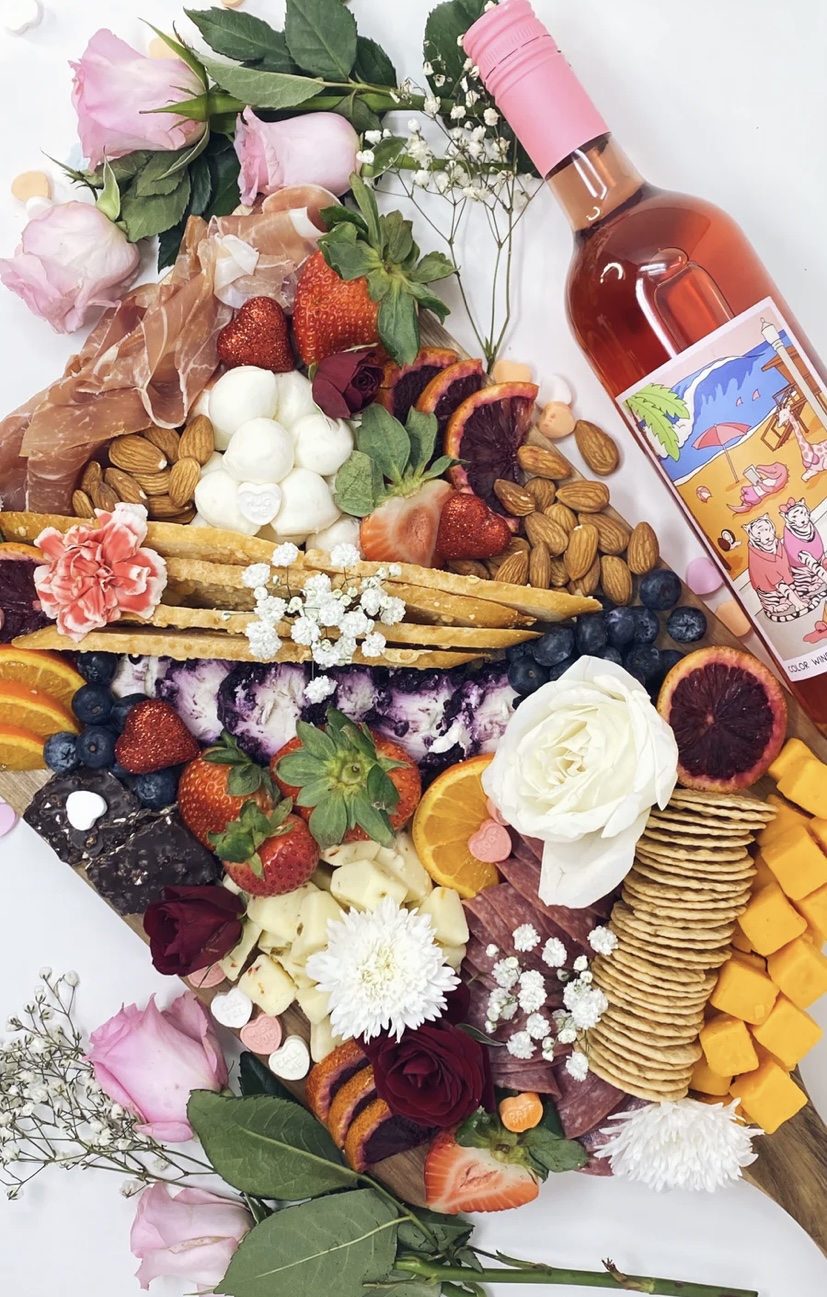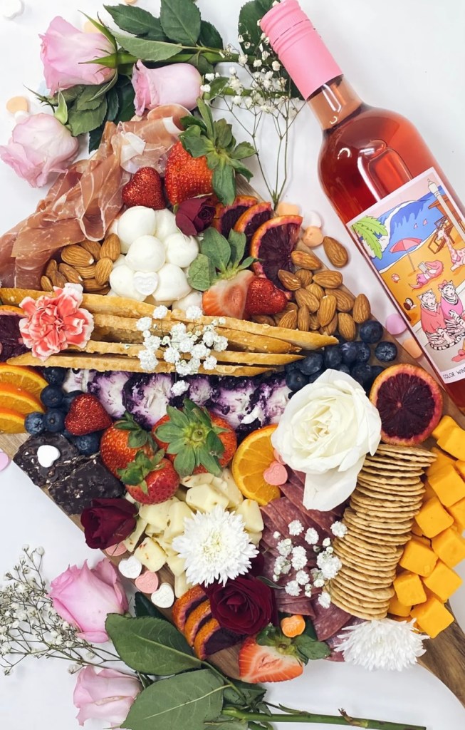 -Use flowers or herbs to enhance your board visually as shown in the picture below. Just make sure you choose flowers that are safe if touching food. And, of course, WINE!