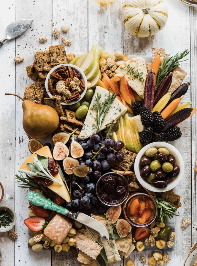 *1-2 Fruits – grapes, berries, apples, pears, figs, and oranges are all great options and will add beautiful color to your board
