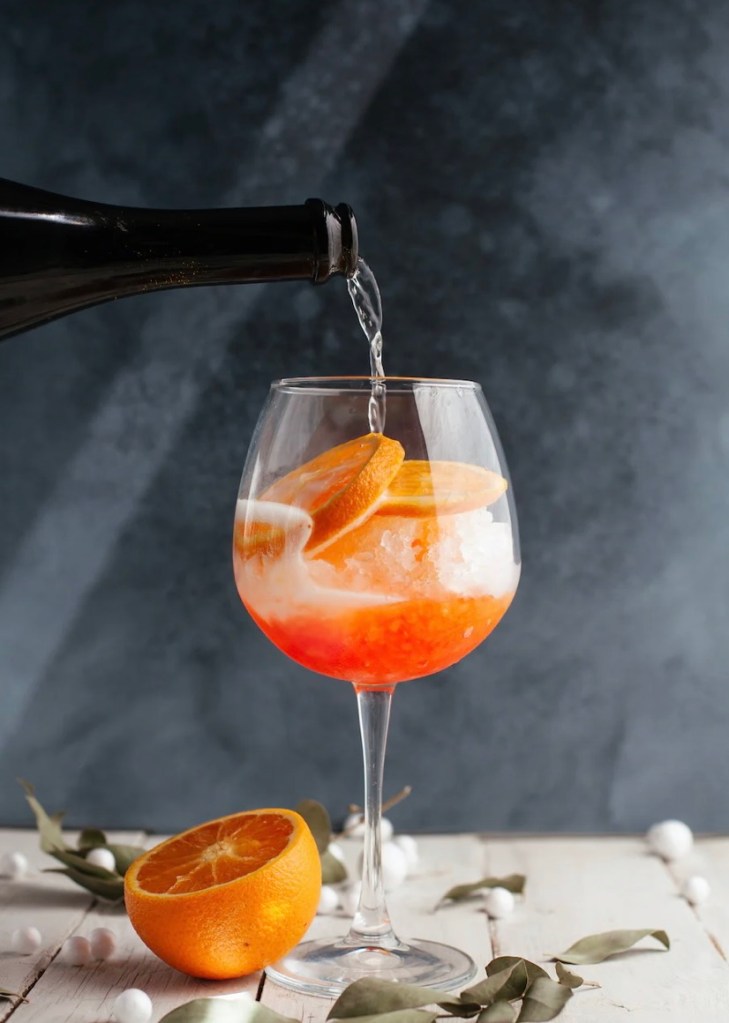 Mix all ingredients in a large wine glass with ice and gently stir. Garnish with an orange slice. To make a “Venetian” spritz, you can also garnish with a green olive.